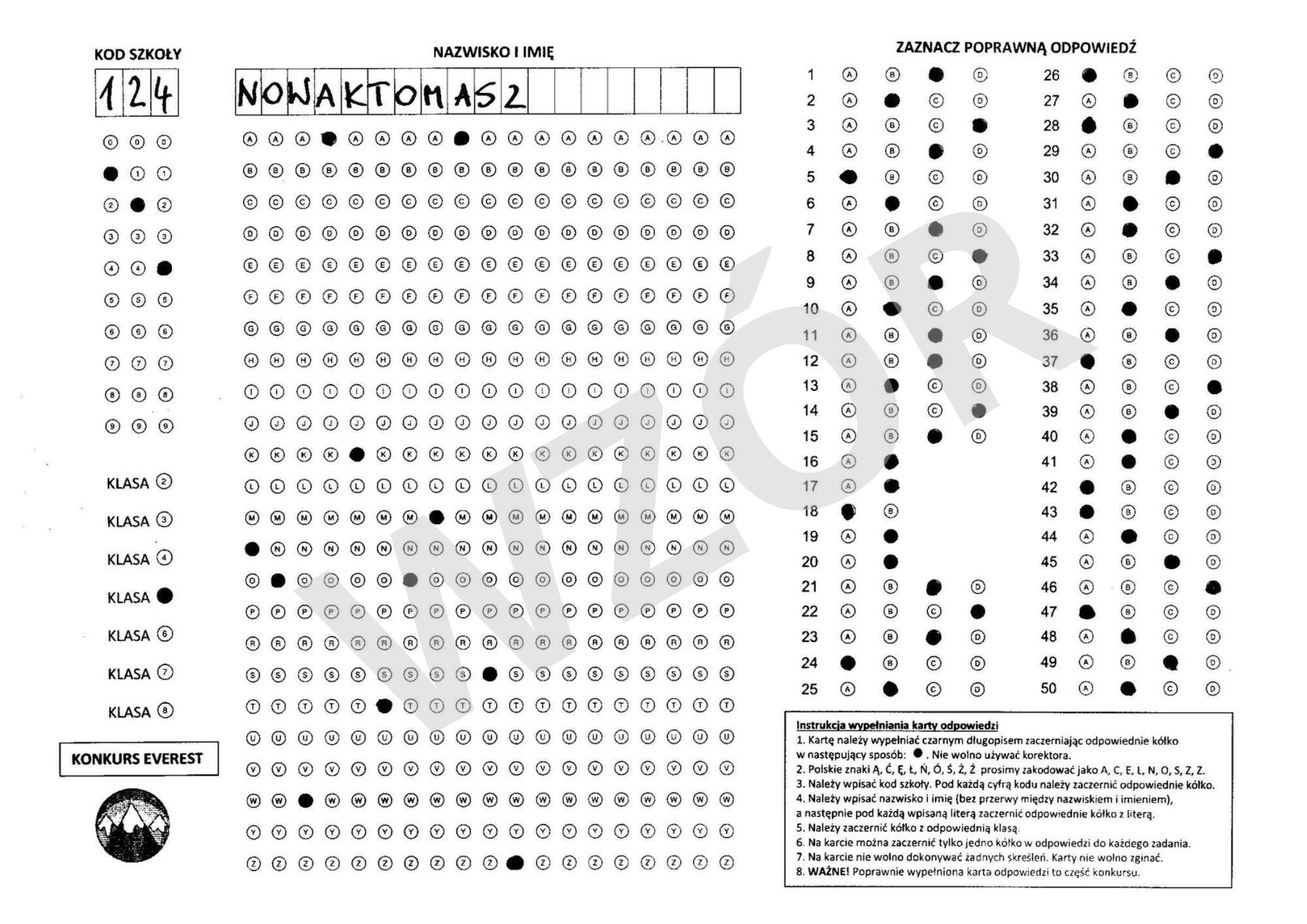 Instrukcja wypełniania karty odpowiedzi